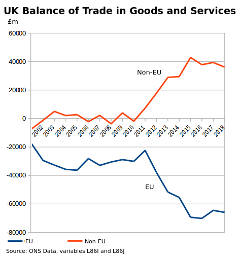 Something has been going badly wrong with UK-EU Trade. The UK-EU Trade Deficit was £66 billion in 2018. Why? It is not because the UK is failing to produce the goods and services that people want because the UK is in surplus with the world outside the EU by £ 36 billion pa.
